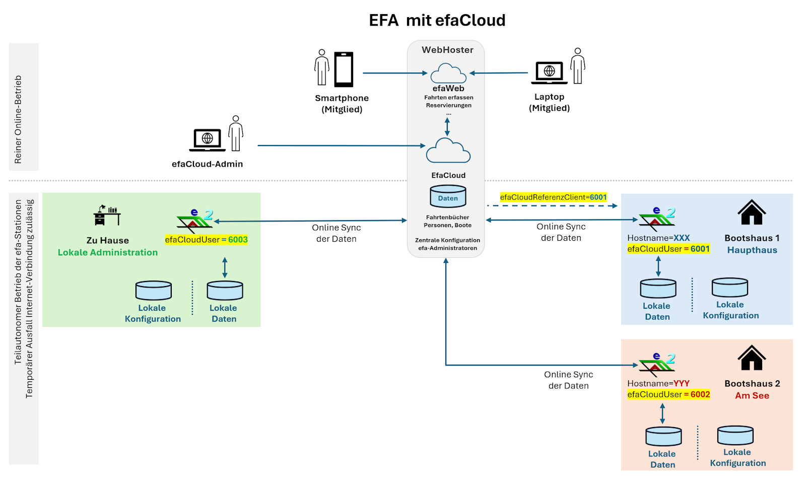 Für den Betrieb von Bootshäusern, die auch mal weitab von DSL oder in schlecht versorgten Mobilfunkgebieten stehen, ist das nicht tolerabel. Daher behalten bei efaCloud die einzelnen efa2-Stationen (zu Hause, in den Bootshäusern) ihre Autonomie.