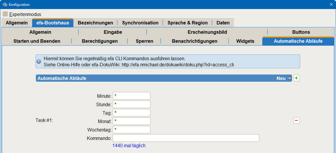Hinweis: wird efa in Kombination von efaRemote oder efaCloud und mehreren Bootshäusern eingesetzt, sollten die automatischen Abläufe in jedem Bootshaus mind. 5 Minuten zeitversetzt laufen.