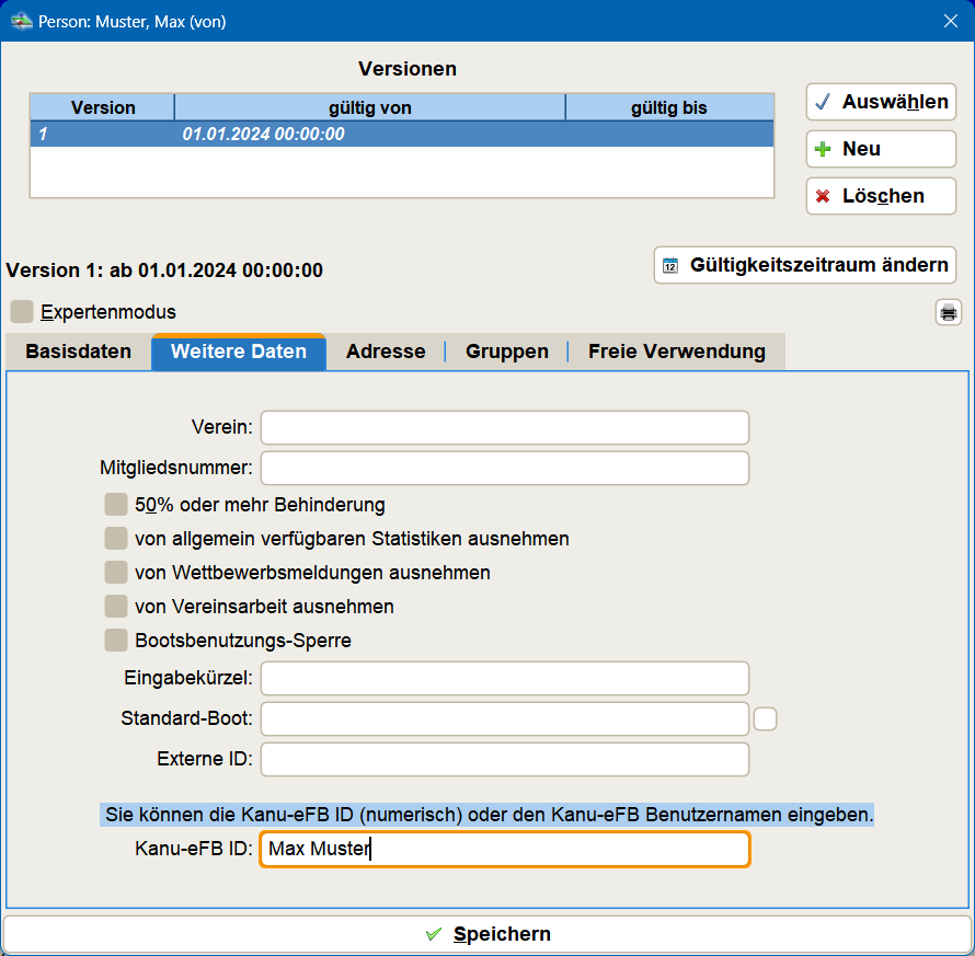 Die Kanu-EFB-ID ist üblicherweise in den Dialogen nur sichtbar, wenn der Expertenmodus aktiviert ist. Dies hängt damit zusammen, dass die Felder nur für Kanu-Vereine sinnvoll nutzbar sind.