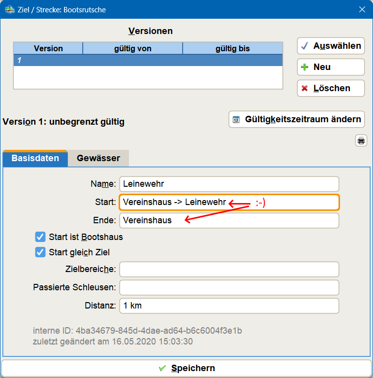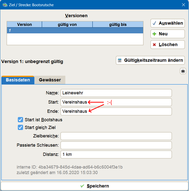 Dies ist bei der Übertragung in das Kanu-EFB unschön, da EFA hier tatsächlich Start und Ziel überträgt. Das passiert bei einer klassischen Pflege der Ziele: