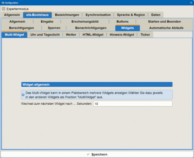 Da die meisten EFA-Installationen im Bootshaus weniger Platz zur Verfügung haben, gibt es in der Mitte unterhalb der Uhrzeit das Multiwidget, das mehrere Widgetinhalte zeitlich hintereinander darstellen kann.
